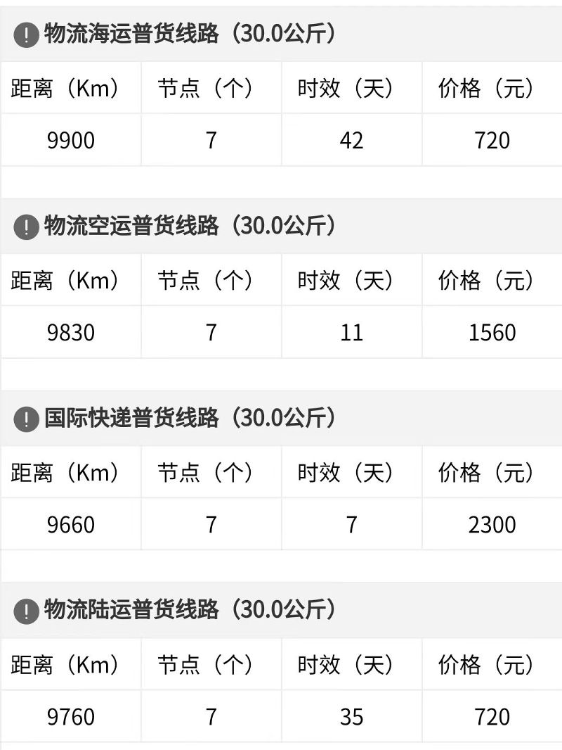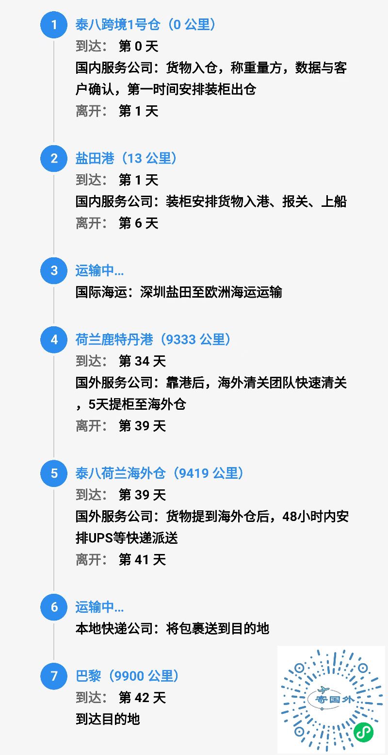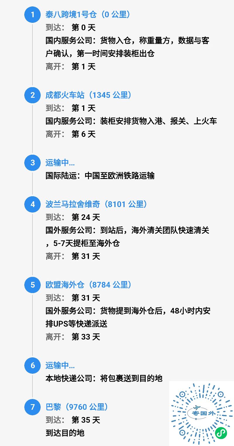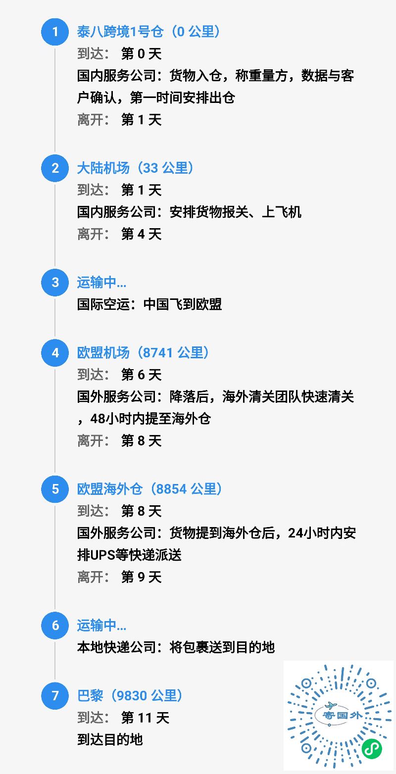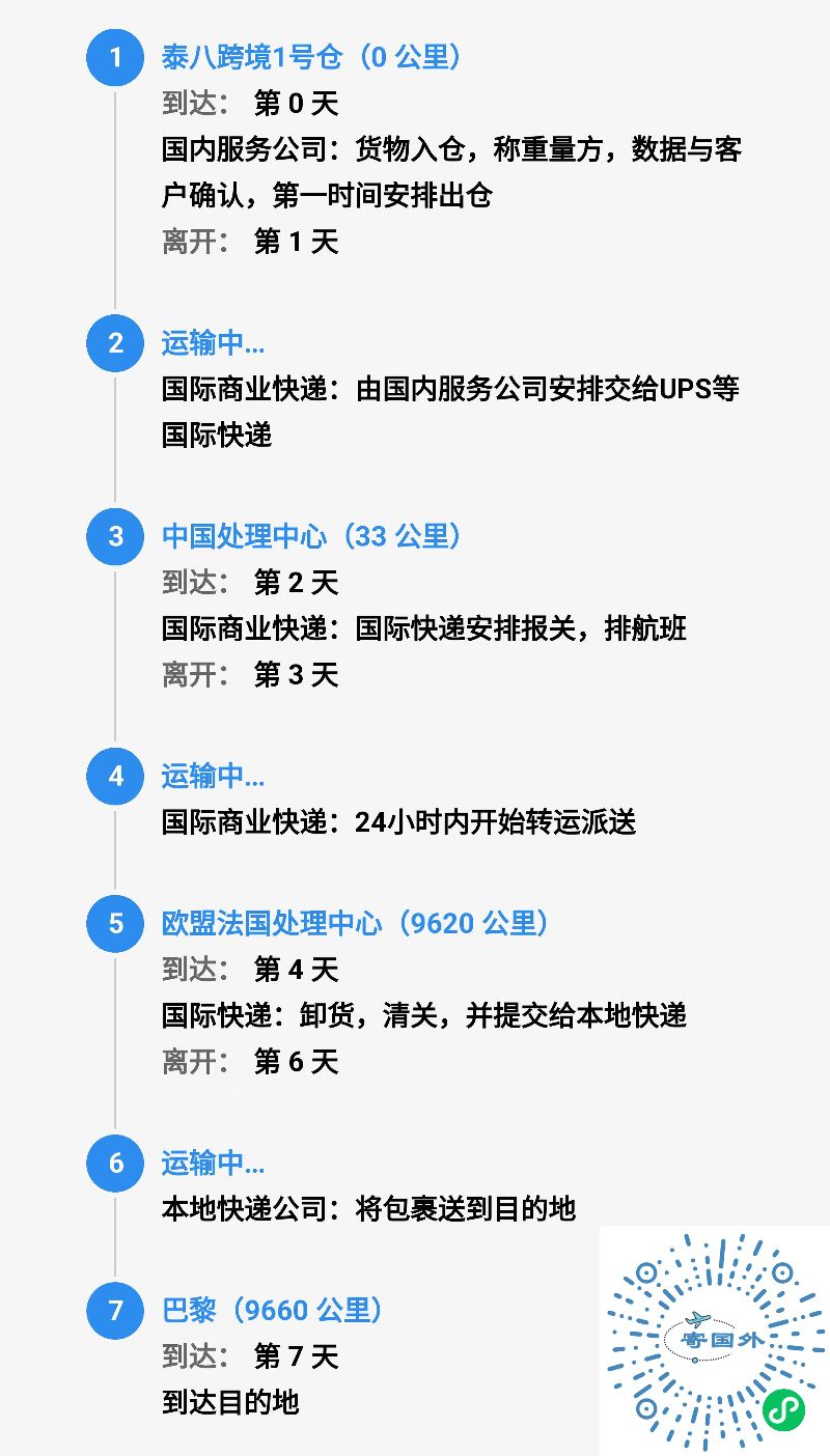 泰八跨境服务提供四种运输方式(以寄30公斤物品到巴黎为例展示大致行程及时效):