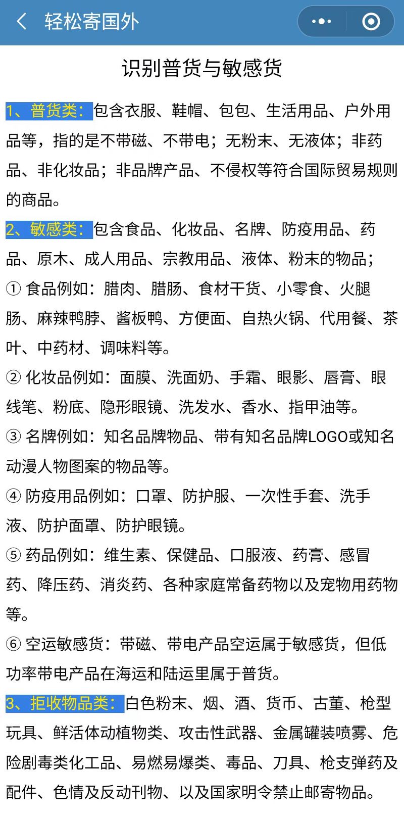 跨境运输的物品分普货和敏感货,运输的价格会有区别,普货和敏感货的大致列表如下,如果您有疑问,请在小程序顶部位置直接联系客服咨询;