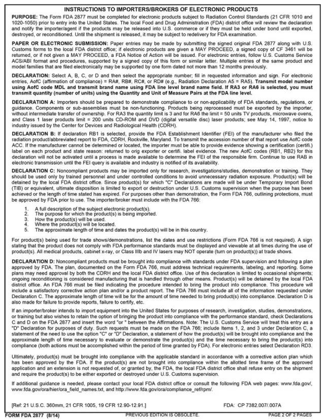 FDA申报▼ 进口商在辐射性产品进口通关时除向海关申报以外,还必须以FDA2877表格(符合辐射控制标准的进口电子产品声明<附表格>) 向FDA申报。 申报表除了需列明生产厂、进口商、产品等的有关信息外,符合FDA监管范围内性能标准的产品,还需要上述的外国生产厂在FDA的注册号。申报资料不全或不符合要求,都会直接被FDA拒之门外,即使海关批准放行也不能进入美国市场销售。除了对申报资料进行审核之外,FDA还有权在其进入市场之前或之后进行取样、检验,以检查此进口产品是否确实符合美国有关法规的强制性要求,对违规产品FDA将严格处理。 FDA2877表格: FDA 的处罚▼ FDA 的处罚有两种:对违规产品的处罚有扣留、退回外国和就地销毁,与医疗器械类似,对违规电子产品也有“自动扣留”的制度;而对有意违规或假报资料,,情节严重的,根据有关法律法规,可以罚款或判刑或两者兼有。