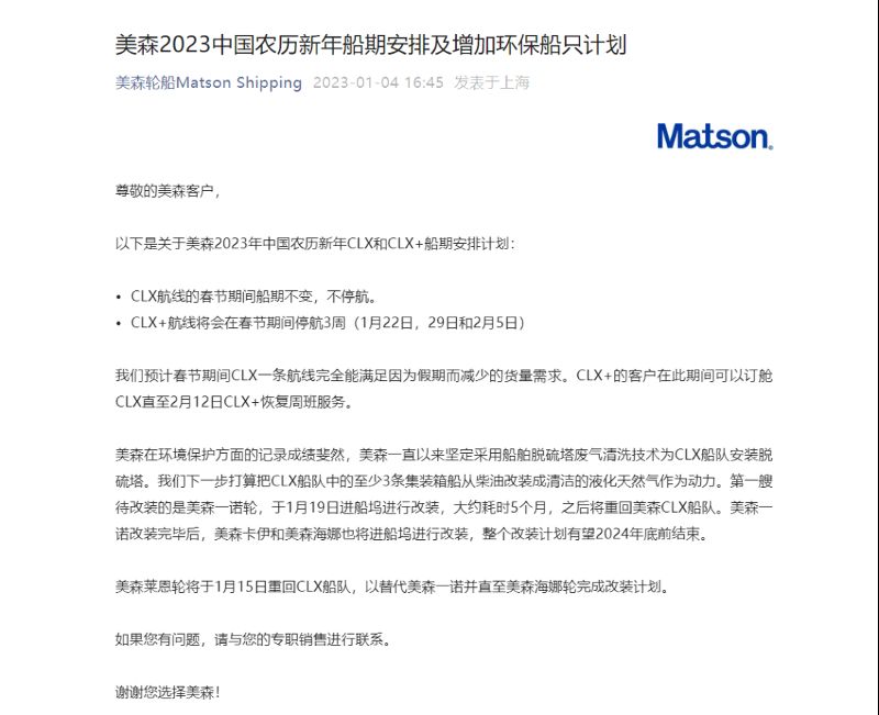 春节将至,美森加班 以星停航3水,跨境卖家应根据销量提前做好备好发货计划,以免影响货物运输时间的延迟导致库容不足。