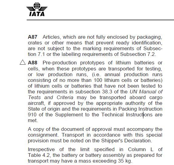 然而,在实际工作中经常会有部分小批量的锂电池需要空运去进行检测或做样品展示,针对这种情况,国际民航组织给出了一个特别的解决方法,即A88特别条款的批准方式:
