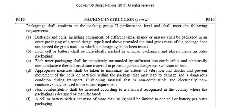 该条款的主要内容:批量生产之前原型锂电池组或锂电池,当出于试验目的或低产量(即年产量不超过100个)的锂电池进行运输,在没有经过联合国《试验和标准手册》UN38.3测试情况下,如果始发国有关当局的批准,并且满足包装指示910条款的要求,可仅限制货机运输。批准文件须随同货物运输,并且注明在托运人的申报单上。