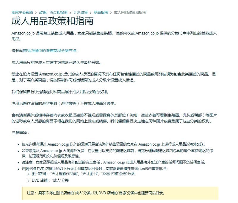 比如,日本亚马逊,在官方规则里明确,卖家只能销售变装服、性感内衣或部分可允许的二级类目成人用品。而且,只能销售给已确认年龄的买家。