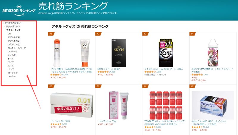 我们通过上图【日本亚马逊成人用品排行榜】的左侧可以看到,日本亚马逊可以销售的成人用品放在药店类目下的,分类包括:SM用品、成人内衣、成人杂货、CosPlay变装服、服装配件、安全套等等(不能翻译太多,不然敏感词一堆,文章很难过审,请谅解)。