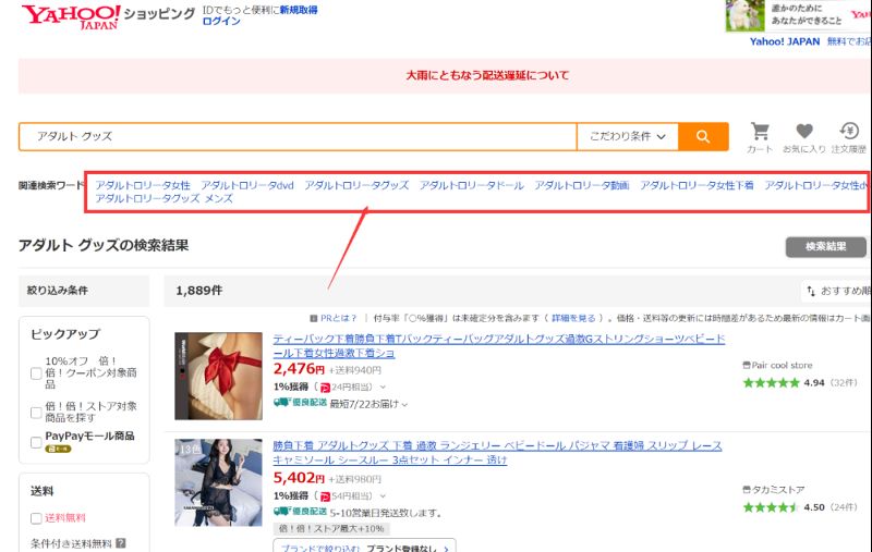 日本雅虎对于成人用品的售卖基本跟日本亚马逊保持一致。但是有一条更加严格的规定,那就是在正常关键字搜索期间不显示与成人相关的商品。而且,日本雅虎对于DVD、写真集、或者有明显诱导性的成人用品也是禁止的。