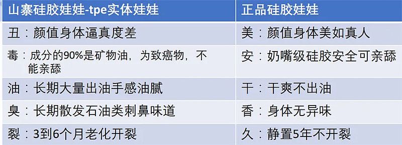 “TPE石蜡油材质的娃娃虽然价格便宜,但是缺点也非常突出,那就是‘丑油臭毒裂’——颜值丑不逼真;身体出油多手感油腻;身体散发浓烈异味;不可亲舔因为矿物油是致癌物;使用寿命短三五个月就会自然开裂,因此使用体验极差。”春叔介绍道,“很多消费者在无良商家的误导下,误买了TPE材质的‘山寨硅胶娃娃’导致后悔莫及。只有像春水堂这样采用昂贵的液态硅胶材料制作的娃娃,才是真正的硅胶娃娃。”